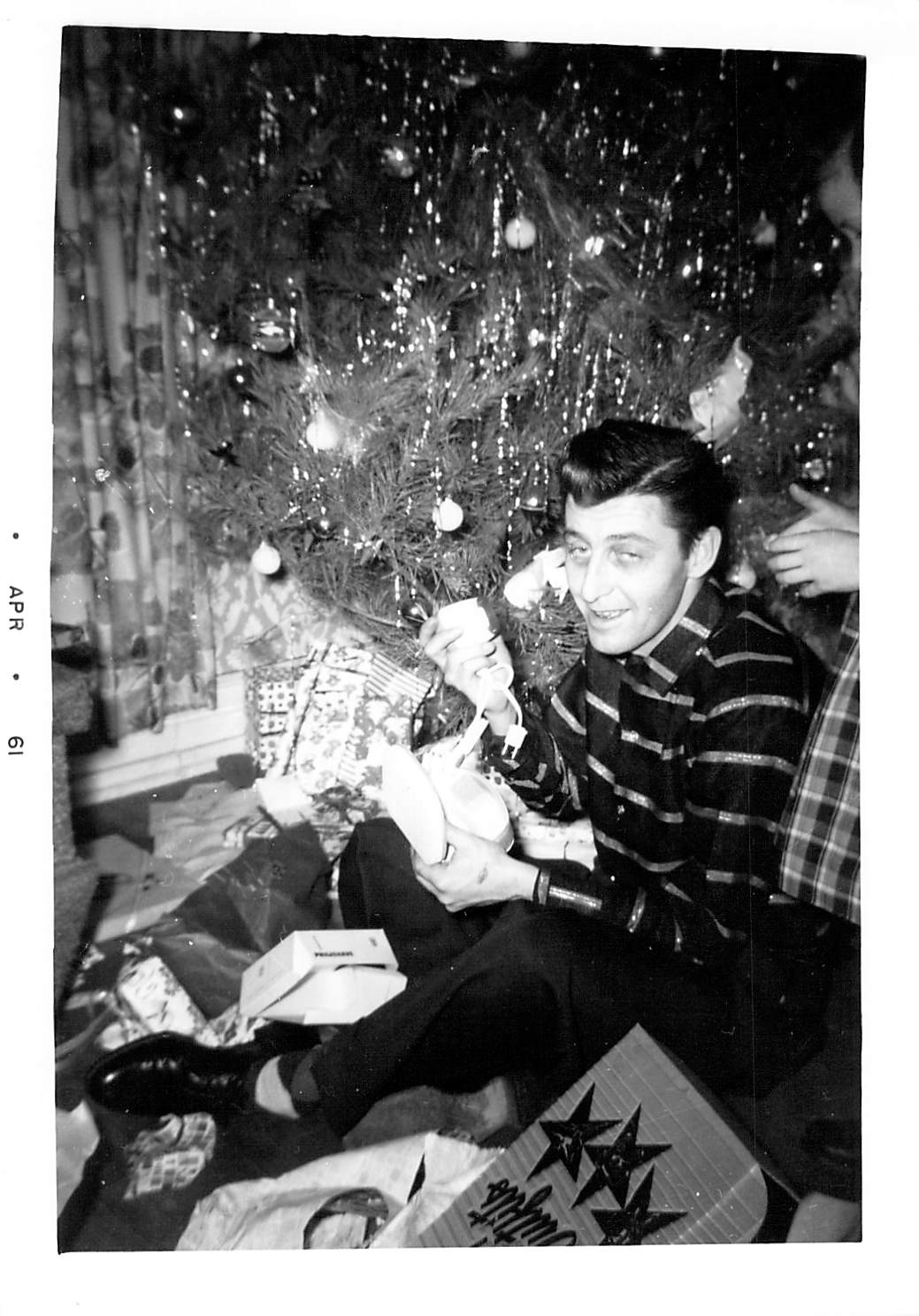 The Christmas tradition held that our father would position himself by the tree and hand out presents, in an orderly fashion, even though I for one would have preferred to dive into the middle of the stack and shred wrapping paper in a wild frenzy. This of course was not permitted. We did not open presents on Christmas eve, to my recollection, though it seems unlikely this picture was taken on Christmas morning, the way my father and sister are dressed. That is an electric razor he is holding.