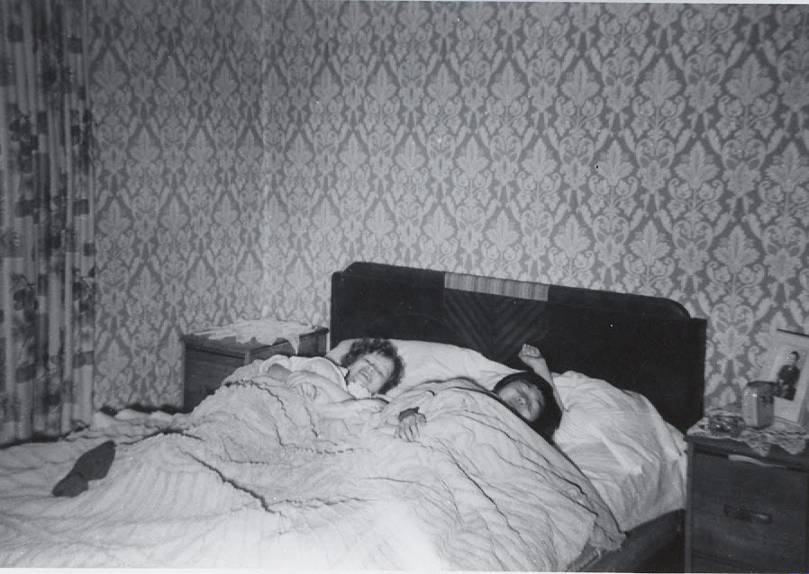 The night stands were made by our father, from an old double pedestal vanity that he disassembled and hand sanded and varnished. The fact that the night stand on the right has a portrait of me, an alarm clock and an ashtray, tells me that this is not their bed.