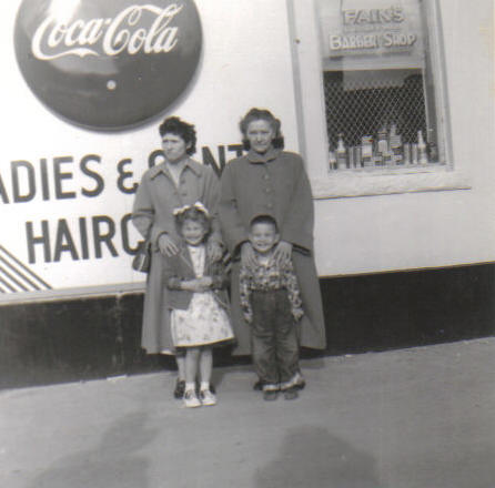 They weren’t nuns but they were Catholic. On the left, at the back, is Grandma Ducharme. She was Uncle Dan’s sister and Lillian’s mother (you’ll see them later). On the right is Aunt Mary, Uncle Dan’s wife. They look stern and unfriendly but actually they were just the opposite. See how lovely my Evil Sister is dressed, with her oxfords, ribbons in her hair, a flower dress and a nice spring jacket. I, on the other hand, look like a homeless person, with ragged pants, worn at the knees and a shirt that looks like it came from the rag bin. It is apropos that we are standing in front of the barbershop and I am the only one with no hair. I can almost promise you that my brush cut did not happen at the barber. For some reason my father fancied himself a barber. I think it was from his army days. He managed to find some manual hair clippers (hand operated, sans electricity) and for several years, off and on, he would cut my hair into stubble. The clippers did more hair pulling than clipping. But I was just a little kid, so I didn’t know or care what my hair looked like. When I was 13, he cut my hair after he returned from a few hours at the Legion. I’ll show you that lovely piece of work later.
