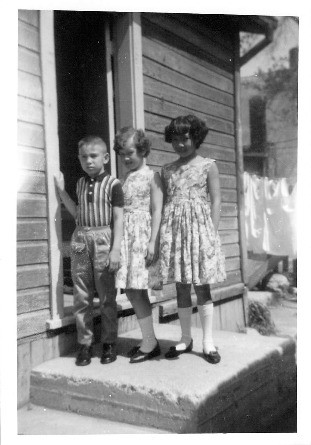Here we are standing on the stoop of our Selkirk house. This was at the back of the house, even though it was our front door. You can see that we are smartly dressed, likely readied for our first day at the new school. Lil still lived with us. I continued to suffer the humiliation of my father’s hair cutting. My expression shows how excited I am about getting to go to a strange new school. The Evil Sister is digging her fingernails into my spine, trying to make me smile for the camera and the Angel Monster is inside continuing to poop in his pants.