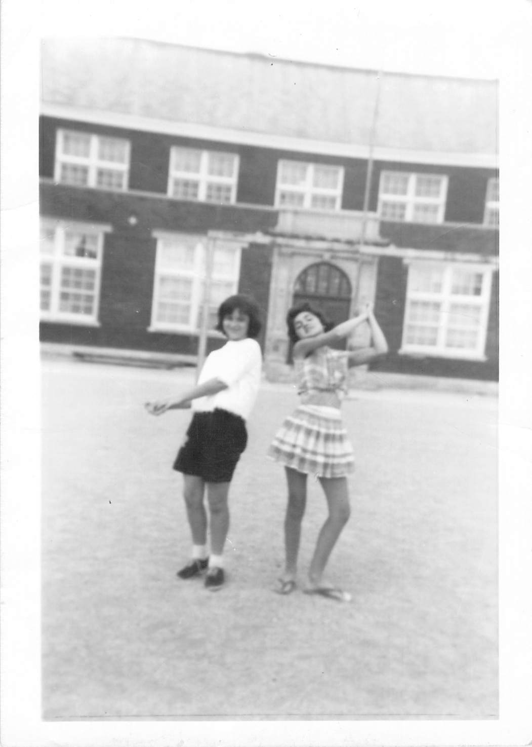 There were two school houses on the Machray School property. The red brick two story, where the kindergarten to grade two’s went and the three-story sandstone, with the circular fire-escape slide, where the grade three to six went. The big kids in the big school. There were even bigger kids in our new neighborhood, bigger than the grade sixers. Here are a couple. This is Karen and Joyce, posing for the camera in the school yard. That is the little kids Machray School in the background.