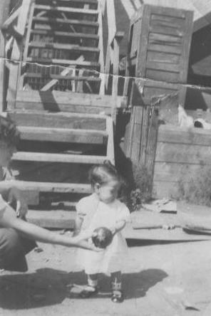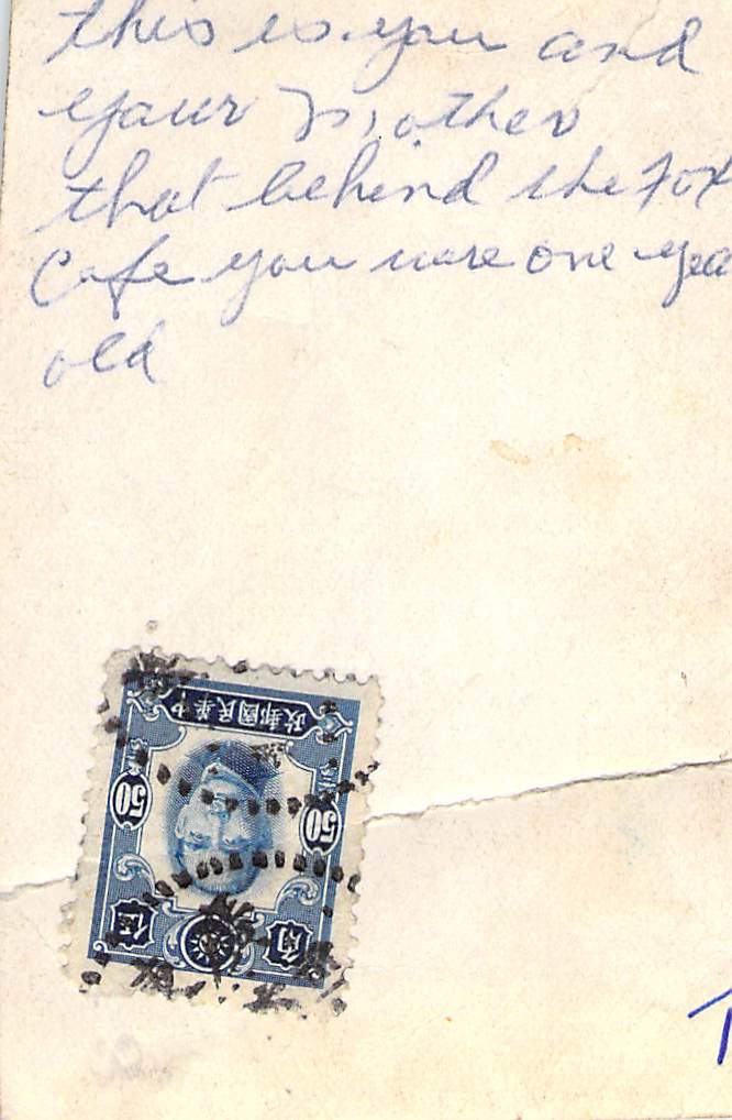 I found this deep in the depths of the old photo pile. A picture of Helen, with her mother, behind the Fox Café in Winnipeg when she was 1 year old. So, taken in 1936. On the back of the photo is the note describing it and a Chinese postage stamp that has been affixed.
