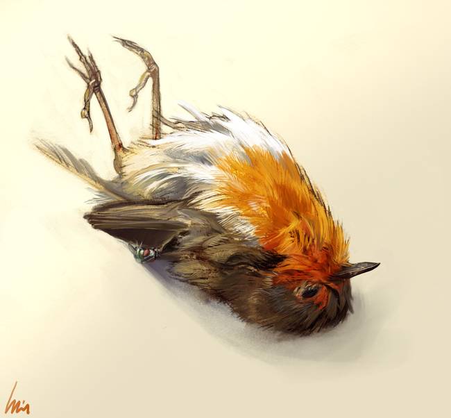 They all looked at me. I nudged it with my toe. All eyes turned to the bird, anticipating some response. My cousins fingers curled into the skin on my arms, clutching like tiny claws. I nudged it again; still it did not move. I crouched for a better look. Wesley crouched beside me, leaned in and blew on the still feathers. Nothing. I reached over and poked a cautious finger onto the breast of the small creature. It was hard. Nothing. My cousin squealed and ran behind a nearby tree.