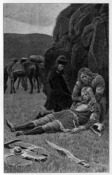 would most certainly not have failed to avenge a man like Kjartan. Unable to resist their mother’s taunts, the brothers start planning an attack. Riding out with a party of ten, including their mother, they find Bolli and Guðrún in a shieling. A man named Helgi Harðbeinsson deals Bolli a heavy blow with a spear and one of Kjartan’s brothers then severs his head. Helgi wipes his spear clean on Guðrún’s shawl and Guðrún smiles. Helgi remarks that his “own death lies under the end of that shawl”.